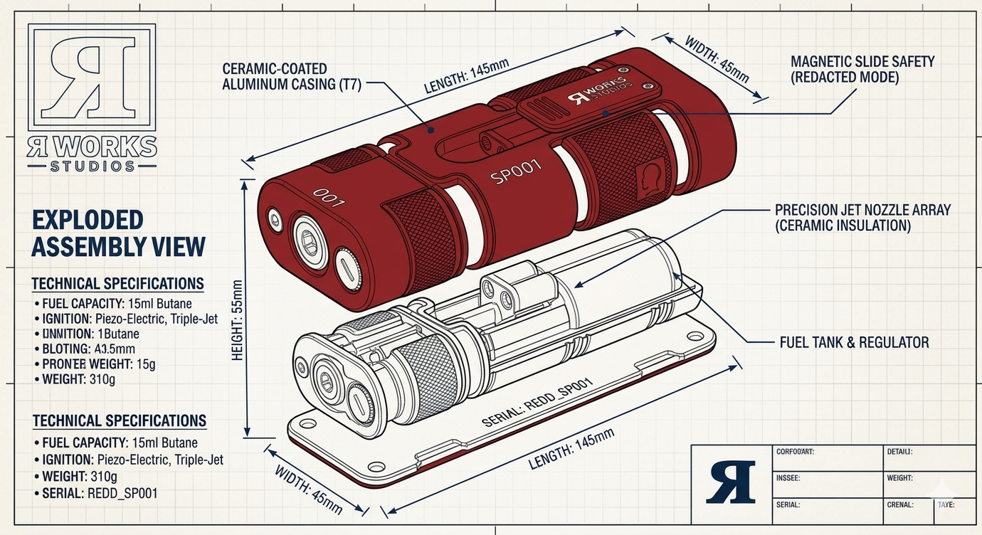 A premium, aircraft-grade aluminum butane torch, finished in я WORKS Matte Red ceramic—engineered to resemble a salvaged component from the “ZibbZabb” cockpit.