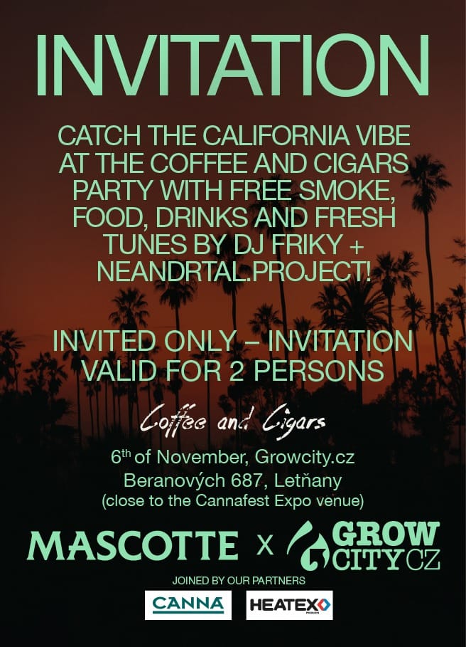 Before the weekend hits, Growcity.cz and Mascotte are bringing a slice of California cool to Prague with their Coffee and Cigars party — an invitation-only evening of food, drinks, and “free smoke,” soundtracked by DJ Friky and NeandrTal.Project.