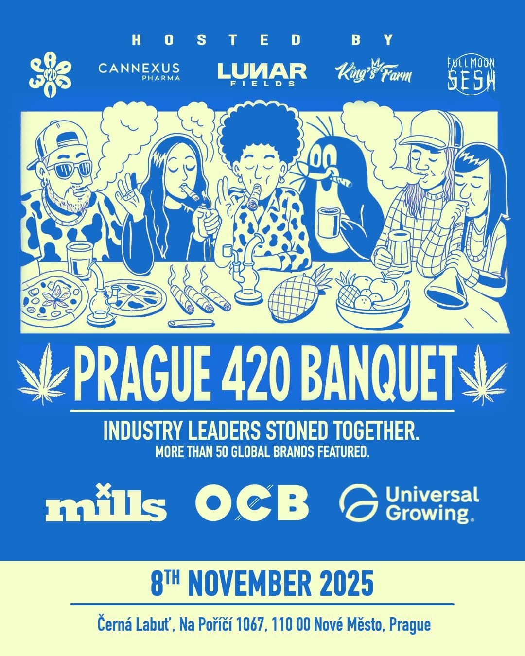 Capping off the week’s celebrations, the Prague 420 Banquet promises to be a feast for the senses — and for the industry. Taking place on Saturday, November 8th at Černá Labuť (Na Poříčí 1067, Prague 1), this invite-only dinner brings together over 50 global brands for an evening of food, smoke, and fellowship under the banner “Industry Leaders Stoned Together.”