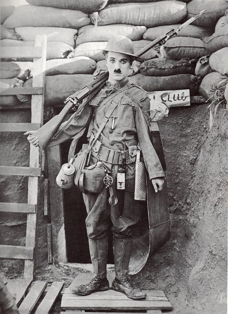 Speaking of Chaplin: Let’s note that in 1918, after four years of carnage, trench warfare, poison gas, atrocity stories, and battlefield butchery (the British suffered 60,000 casualties on the first day at the Battle of the Somme in 1916), Charlie Chaplin took a big artistic risk with his then-ascending career and made a successful World War One comedy called Shoulder Arms.